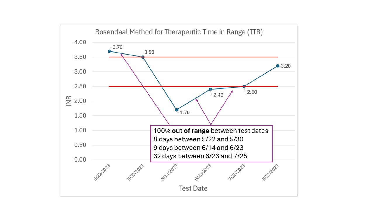 Example: Patient has INR reading of 2.4 on October 1st, then reading of 3.2 on October 17th. Assuming the patient gradually moves towards a reading of 3.2 throughout the 16-day period between Oct 1st and Oct 17th, then we can estimate that the patient was within their INR therapeutic range [2 - 3] for a majority of that time period. To calculate the value
